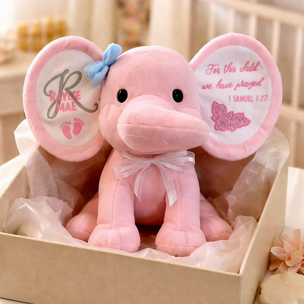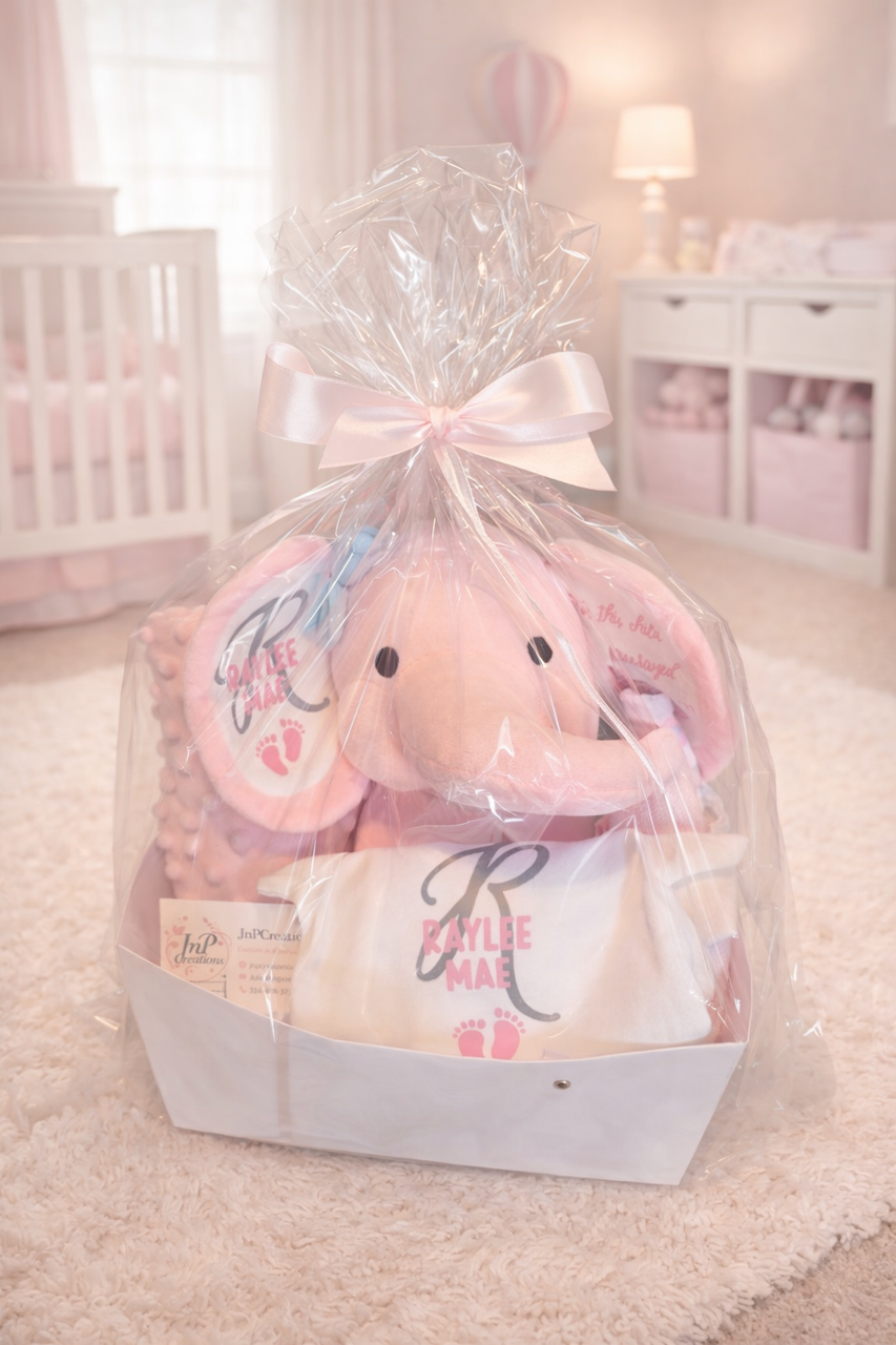 10 inch plush elephant, gray or pink, personalized with your text. Optional gift basket. *Basket includes a 10 inch plush elephant, personalized with baby’s nam