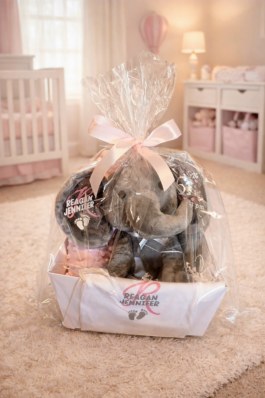 10 inch plush elephant, gray or pink, personalized with your text. Optional gift basket. *Basket includes a 10 inch plush elephant, personalized with baby’s name and birth stats, a matching Gerber brand newborn onesie, a swaddle blanket and 4 baby washcloths. All will arrive in a white cardboard basket with handles, wrapped in cellophane and a bow.